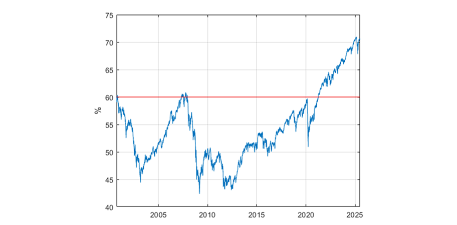 Figure 1. Equity allocation drift in a 60/40 portfolio with no rebalancing