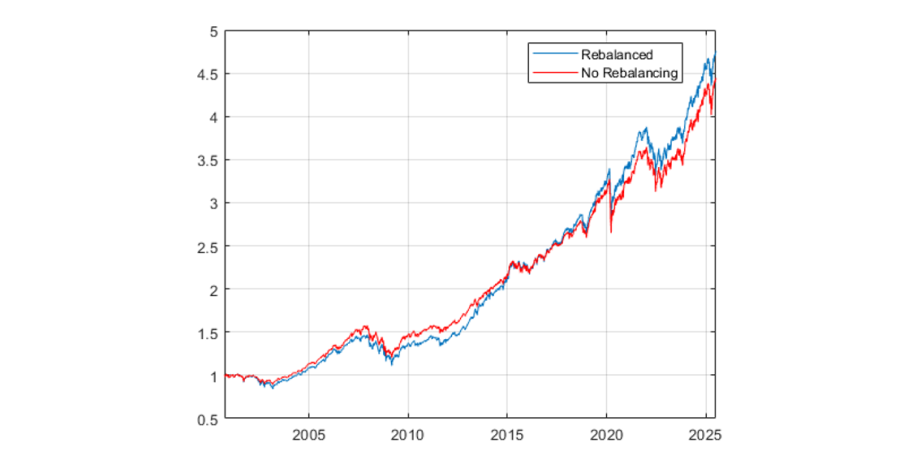 Figure 2. Wealth accumulation for a 60/40 portfolio with and without rebalancing